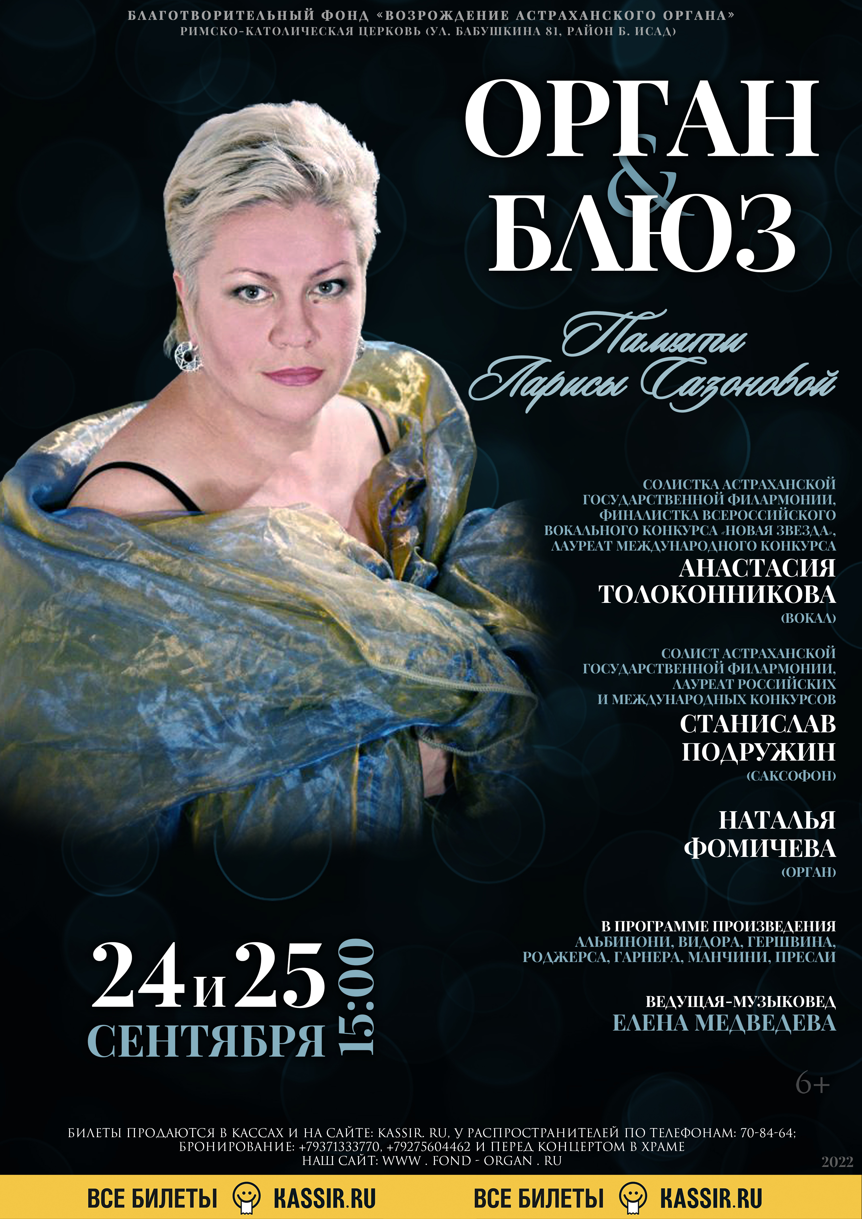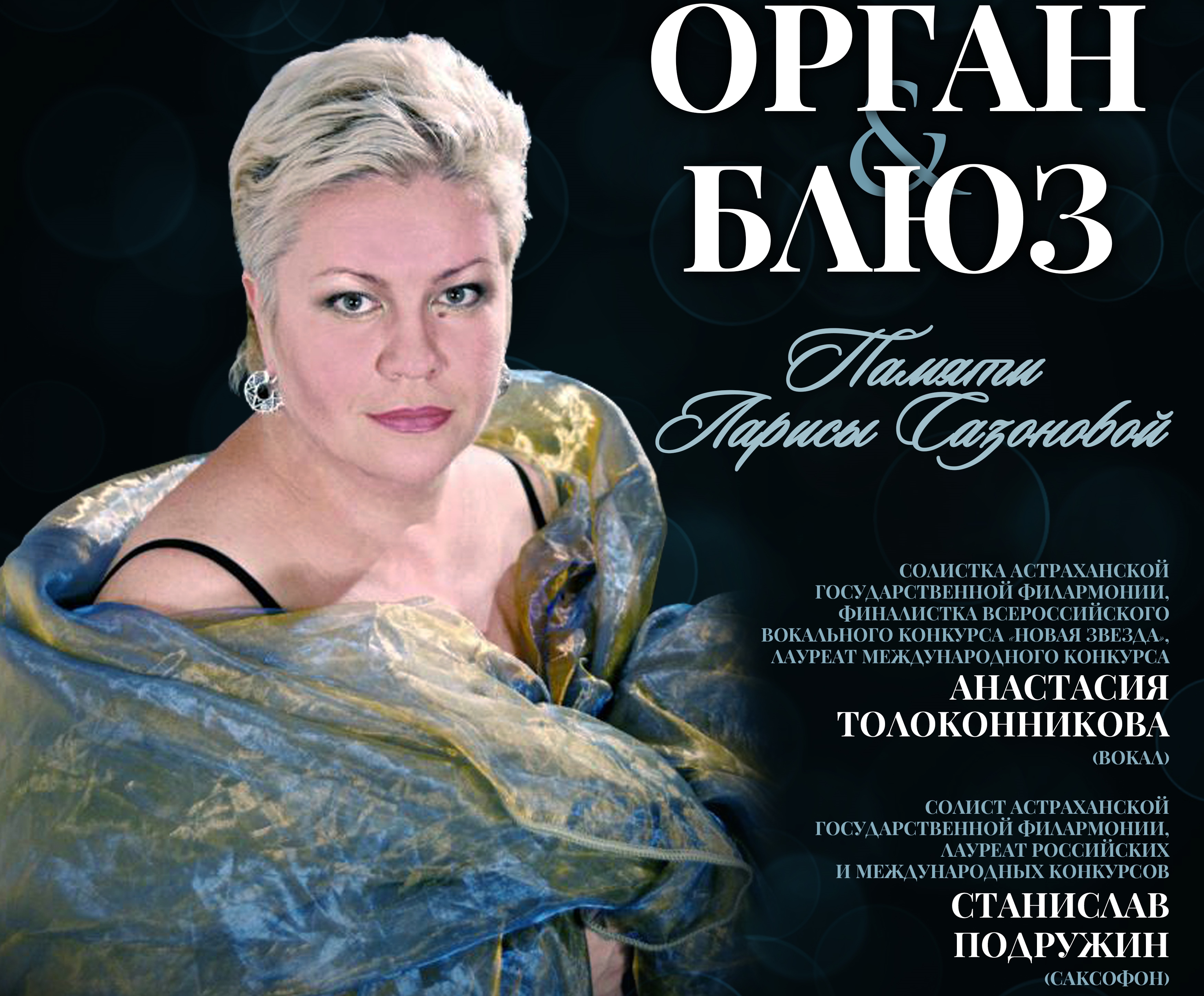 24 и 25 сентября в 15.00 в Римско-католической церкви состоится концерт «Орган и блюз», посвящённый памяти Ларисы Сазоновой – блистательной джазовой певицы. Её имя внесено во Всероссийскую энциклопедию джаза, астраханцы несомненно помнят концерты с её участием, её завораживающий голос, зовущий в путешествия по просторам джазовой музыки.