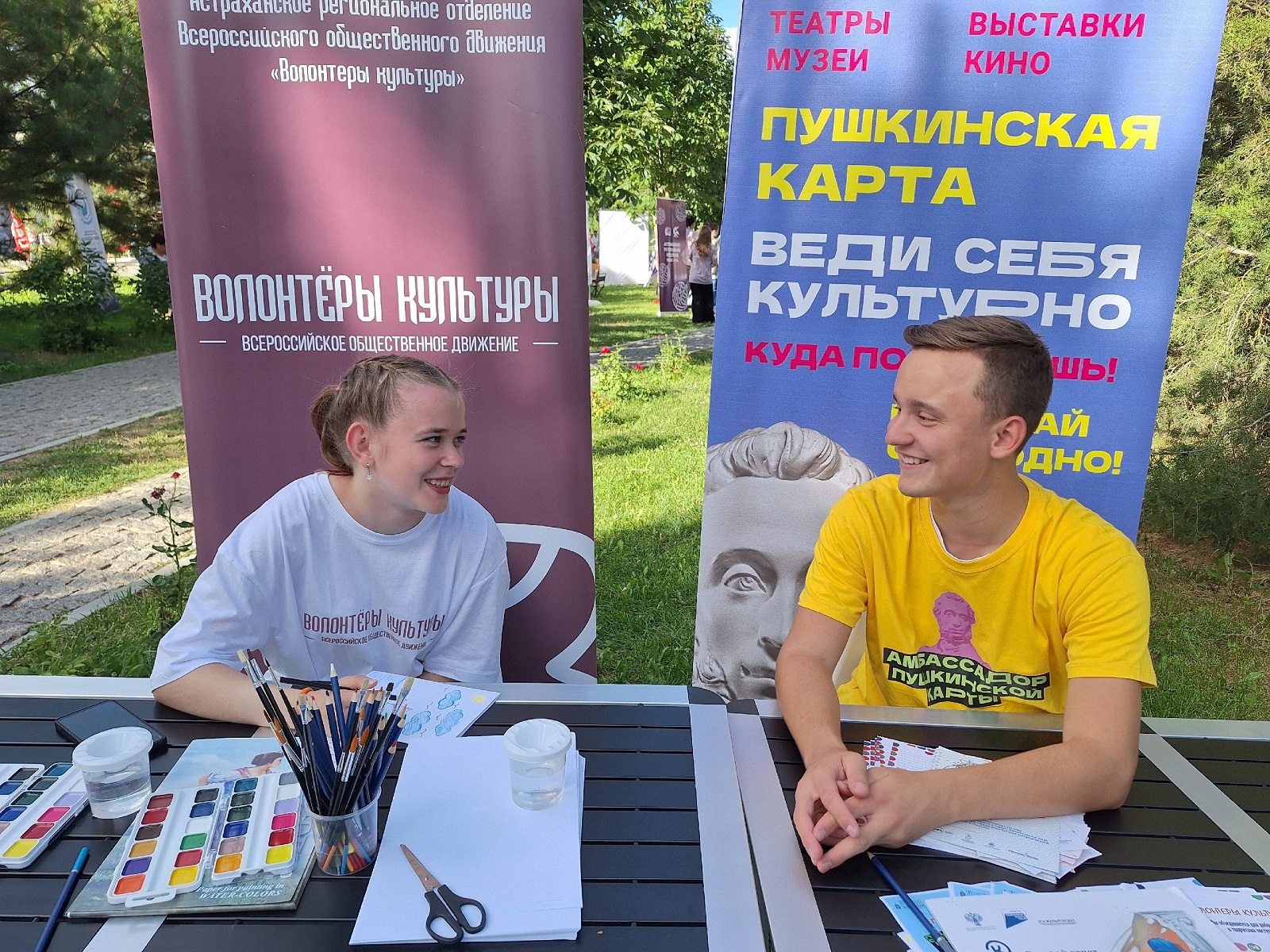 Амбассадоры Пушкинской карты Астраханской области рассказывали о платформе «Культура.РФ», мероприятиях и местах, которые можно посетить, купив билет по Пушкинской карте. Также оказывали помощь в оформлении карты.