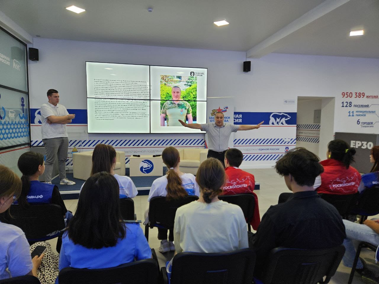 В ходе встречи директор ресурсного центра волонтеров Дмитрий Манцуров рассказал о добровольчестве в сфере оказания поддержки участникам СВО и познакомил молодежь с Сансызбеком Кулкаевым, участником Специальной военной операции. Он поделился с ребятами своей историей, рассказал о быте военнослужащих и тем, как изменилась его жизнь после возвращения с фронта.